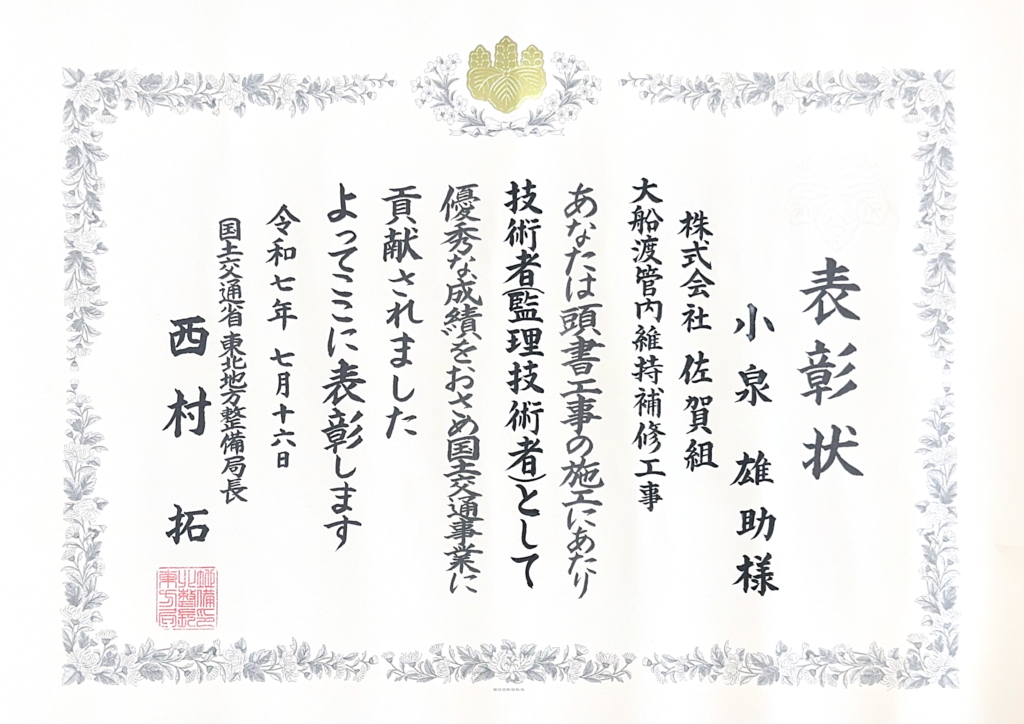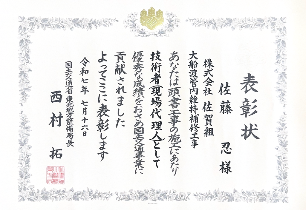 7月16日に、令和7年度 国土交通省 東北地方整備局 国土交通行政関係功労者表彰が仙台市戦災復興記念館にて開催され、株式会社佐賀組では2名が表彰されました!
