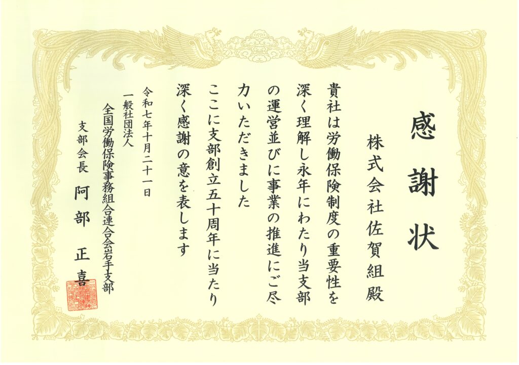 株式会社佐賀組では労働保険制度の重要性を深く理解し、岩手支部様の運営と事業推進に尽力したとして、感謝状をいただきました。
